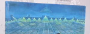 The prisoners were forced to line up mornings and evenings to be counted and often had to stand motionless for several hours. If a prisoner had died their body was placed in a bag and present at roll call as well. One prisoner who was an artist left the painting below. Note the eye in the sky. This was to symbolize the artist thought the eye of God was not present. Also note the rows and rows of prisoners standing in roll call with the lights shining on the from the towers above.