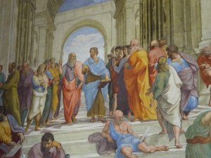 This painting by Raphael depicts all our ancient philosphers, scientists, religious men, poets and artists.  Plato and Aristotle are the two in the very center with Plato on the left in red.  Socrates in on the left in green.  Seated on the steps is Diogenes and to the left of him with his face resting in his hand is Heraclitus but he is depicted with Michelangelo’s face.