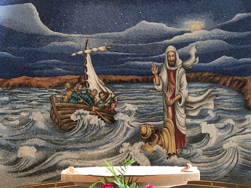 In 2014 a new church was built on the site which was simple in design but also rich in mosaics and murals. Below are a few pieces of the art from the new church which caught my eye.
