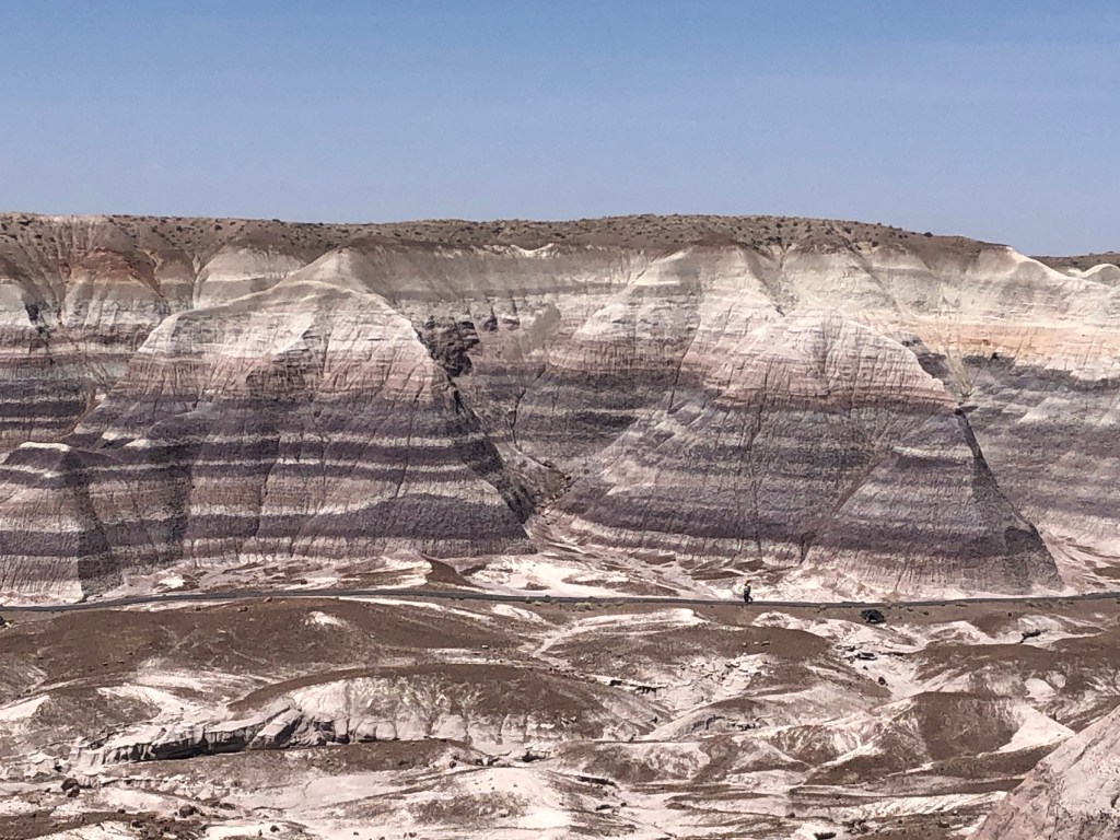 The Painted Desert reminded us very much of the Badlands in South Dakota. Notice here in the Painted Desert the trails where you can walk to see the formations up close.