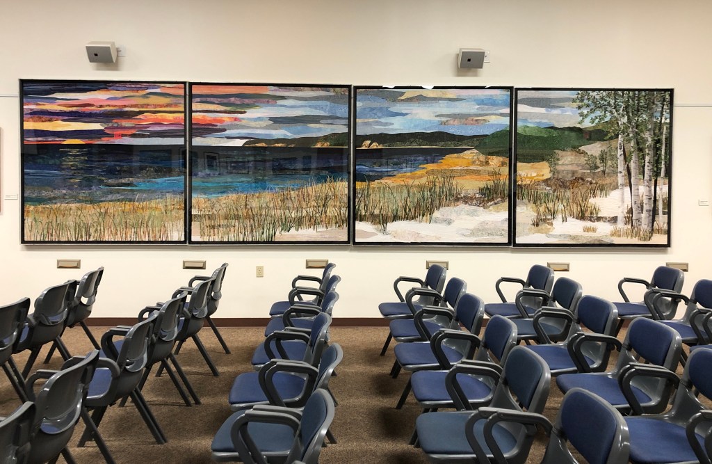 On our third day in Michigan we visited Sleeping Bear Dunes National Lakeshore. We stopped at the visitor center for a map of the park and watched the presentation about the park. When we went in the auditorium William steered me towards the wall displaying a quilt. Yes, a quilt. I had to go up to take a look to verify and was astonished when I saw Ann Loveless’s masterpiece of the park.