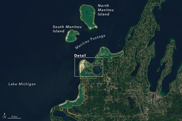 The legend of the park is that there was a famine on the northern peninsula and a momma bear and her two cubs swam across the great lake to find food. The momma bear finally made it ashore, climbed to the top of the dune and waited for the cubs to make it to her. But the cubs got so tired they began to sink. The momma bear was so sad that she just laid there waiting. Eventually she saw them begin to surface but they just could not make it to her. There she waited for eternity and thus was born the Sleeping Bear Dune and both the North & South Manitou Islands. I borrowed the picture below from the park website so you can see the cubs and the dune where the momma bear waits.