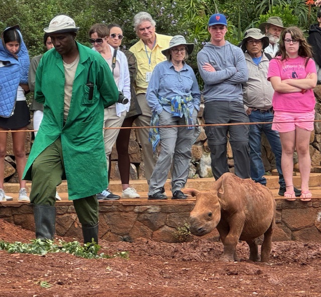 Adjacent to the National Park is the Sheldrick Elephant Orphanage. It is here where elephant orphans are brought and cared for many years before they are reintegrated back into the wild. The center opens to visitor tours once a day and African Horizons had secured a reservation for us to actually see the orphans and learn more about them. I must say this was a highlight of the trip for me. The visitation begins when the orphans get their mid day feeding but before the baby elephants came out of the forest we were introduced to a baby rhino. You couldn’t help but fall in love with the little one. He followed behind every step of his keeper and would stop so you could give him a pat. He was rescued when being attacked by hyenas in the wild and had many surgeries to save his life.
