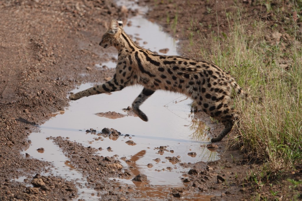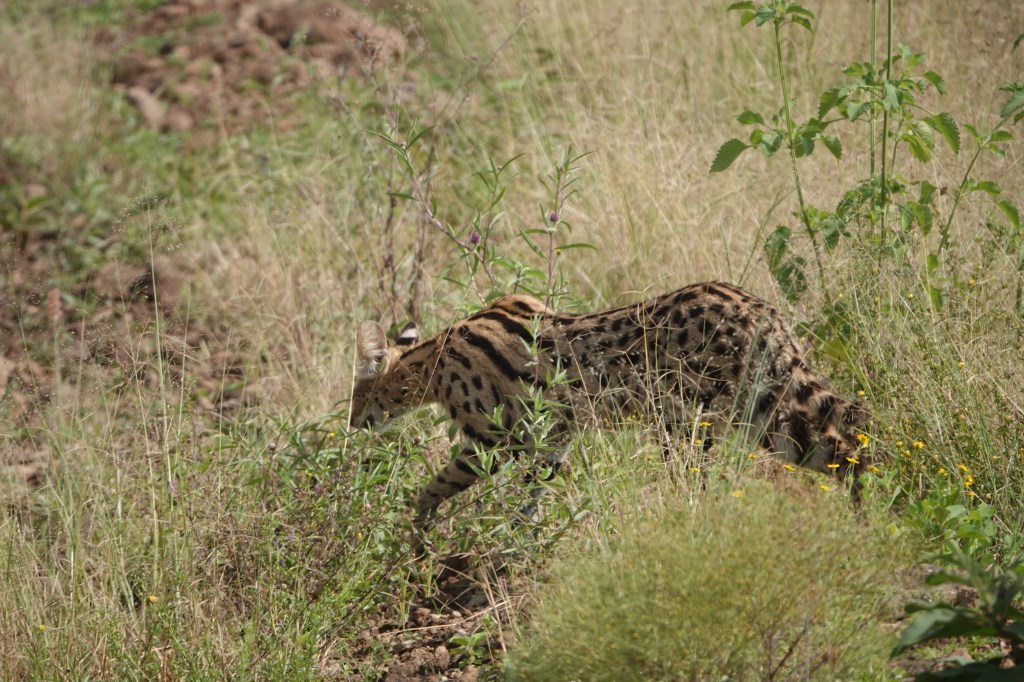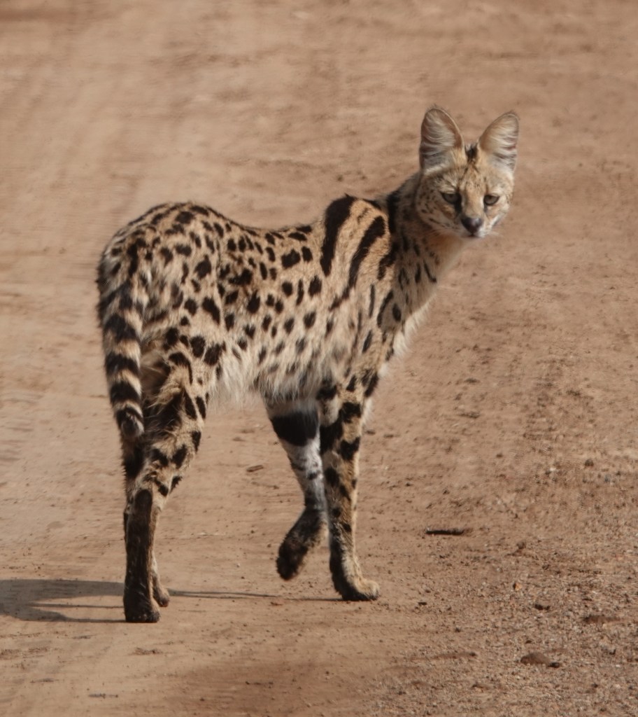 It is very rare to see the Serval Cat but we had the privilege of viewing this cat as he walked along the road in front of our safari vehicle. The serval is a solitary carnivore and is active both by day and at night. It can leap over 6 feet to pounce on its prey.