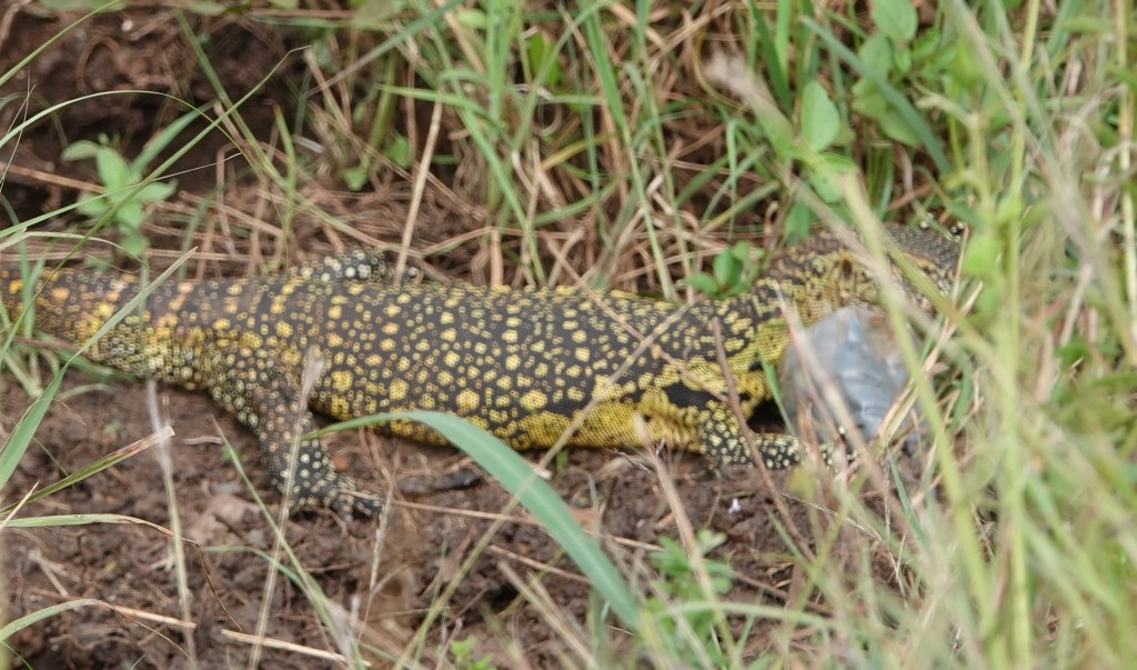 When we came up to the watering hole we could see just the tips of the heads of several hippos but we had already seen so many of them at Amboseli we focused our attention on the reptiles. First we spotted the nile monitor lizard. They are extremely good climbers and swimmers and will prey on small creatures including fish and birds which were in abundance here at the watering hole.