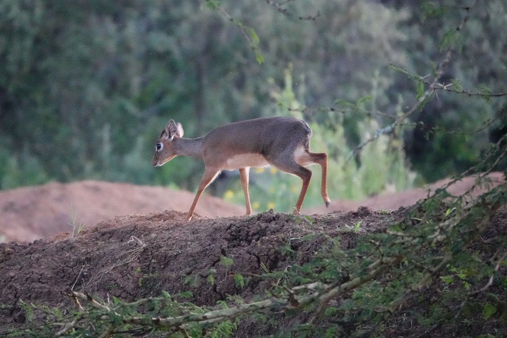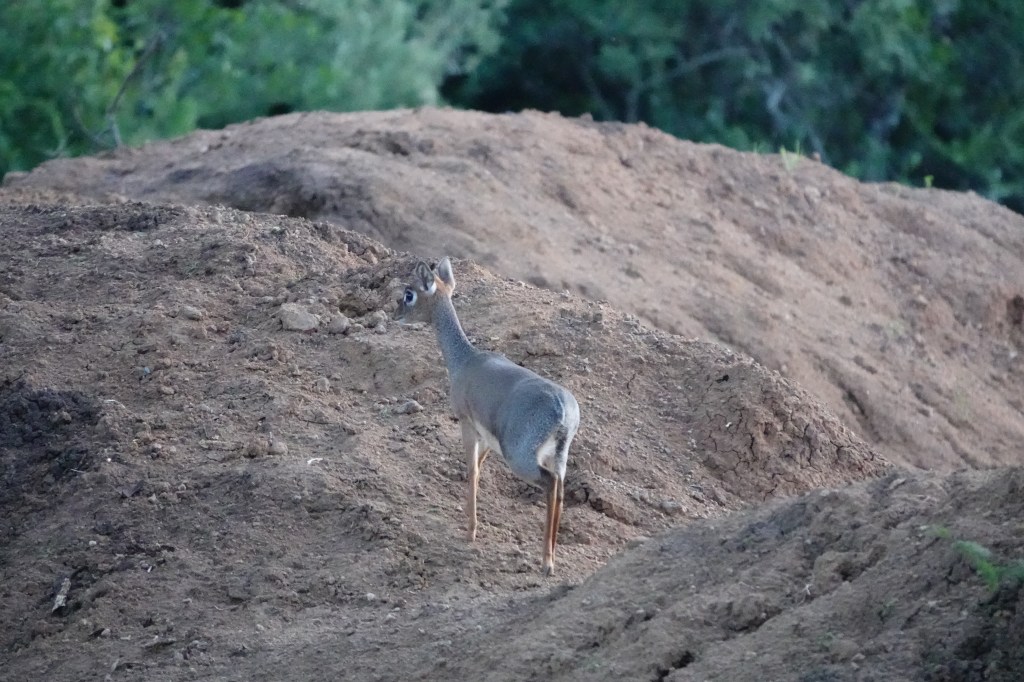 After the leopard sighting we spent the rest of the game drive viewing the abundance of wildlife. On the way out of the lodge this afternoon, Mwok told us of the smallest of antelopes weighing about 10 pounds and we all challenged him saying no way. He told us they are mostly nocturnal, mate for life and live together in the low bush.. They are rarely seen apart from their partners and if one of the dik dik’s should lose their life, the other will commit suicide by making themself visible to predators. By the way, the biggest predator of the dik dik are humans. Their velvety skin is used for making gloves and their small leg bones for making ceremonial jewelry. So just before returning to the lodge Mwok in fact spotted the beautiful little dik dik for us.